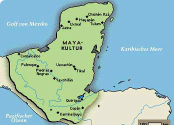 Maya, indianische Völker- und Sprachfamilie. Die Maya sind in den mexikanischen Bundesstaaten Veracruz, Yucatán, Campeche, Tabasco und Chiapas sowie in weiten Teilen Guatemalas und verschiedenen Gebieten in Belize und Honduras beheimatet. Benannt ist die Völkergruppe nach dem auf der Halbinsel Yucatán lebenden Volk der Maya. Zu den weiteren politisch bedeutenden Völkern gehören die Huasteken aus dem Norden von Veracruz; die Tzeltal aus Tabasco und Chiapas; die Chol aus Chiapas; die Quiché, Cakchiquel, Pokonchi und Pokomam aus dem guatemaltekischen Hochland und die Chortí aus Ostguatemala und Westhonduras. Mit Ausnahme der Huasteken bewohnten diese Völker ein zusammenhängendes Territorium. Sie gehörten alle einer einzigen Kultur an, die in vielerlei Hinsicht zu den höchstentwickelten Zivilisationen Amerikas gehörte.