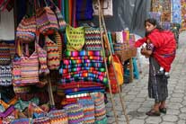 Eine Attraktion des Hochlands sind die Märkte in den Dörfern. Viel authentischer ist die Atmosphäre zum Beispiel auf dem "echten" Indianermarkt in Momostenago, der noch seine eigentliche Funktion als wichtigster Warenumschlagsplatz und Informationsbörse der Einheimischen hat. Im Vergleich zu Chichi oder Panajachel kosten hier die traditionellen indianischen Teppiche und Decken nur die Hälfte und stammen tatsächlich aus Heim- und Handarbeit und nicht aus Webfabriken. In Zunil trafen wir in einer Baracke auf einem Hinterhof auf den heiligen San Simon, die neuzeitliche Mutation einer Maya-Gottheit namens Mam, die in enger Verbindung mit den fünf Unglückstagen des Maya-Kalenders steht. Gleichzeitig soll er für viele den christlichen Judas verkörpern. Sicher ist nur, daß die mannsgroße Holzpuppe, die von Blumen und Kerzen umgeben, mit einem Nadelstreifenanzug und Hut gekleidet, zwar eher nach Mafiosi als nach Gott aussieht, aber trotzdem in diesem Raum eine intensivere Atmosphäre herrschte, als ich jemals in einer Kirche erlebt habe.
